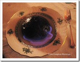 There are many wonderful sauces to accompany steamed puddings. The traditional sauce for plum pudding is hard sauce, which is creamed butter, confectioners' sugar, and flavoring; it goes on "hard" and melts. I don't particularly like it, and neither did my grandmother. Here is the one our family likes--as I have managed to recreate it. I don't think my grandmother used an egg, but I can't get close enough without it; the rest, and the taste, is about right. It's rather boozy (although not nearly as boozy as my grandmother made it); you can cut the liquor in half if you wish--or add more. Plum pud flame 2 copy