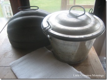 To prepare molds: Butter the insides well, paying special attention to crevices. Using the mold as a tracing guide (turn the mold upside-down), cut out a piece of clean white cloth (I use old sheets) to fit the opening. Butter and flour the cloth on one side.