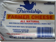 As I had begun to suspect, most stores have stopped carrying farmer’s cheese. You may well ask, why? Because it has a short shelf life, I’m told—it doesn’t last. Oh no: it doesn’t have preservatives—the nerve! It’s a real product—let’s get rid of it and just carry the processed stuff with a half-life of a zillion years! There’s no demand, they say, without irony to a person who is standing in front of them asking for it.