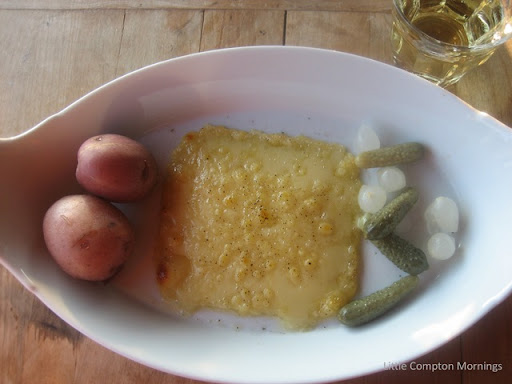 ingredients--queso fundido with chorizo made in her son's carnicería; flautas de pollo (we had a serious and lengthy discussion about the proportions of oil and lard in which to fry them) with salsa verde and all the trimmings; little albóndigas (meatballs) in chipotle sauce; and jícama with chile, lime, and pickled ginger. There were also chicken tamales, a gift from a neighbor's housekeeper in honor of the visitors. Maria and her daughter handled everything--after catering for a dance and a film crew from 8 p.m. until 3 a.m. the previous night. Did I mention she is amazing?The next morning I sat at my sister's flower-covered table eating a leftover chicken tamale with green sauce for breakfast. It was yet another brilliant, 80-degree day. I had absolutely nothing that I had to do. Qué rica, indeed.